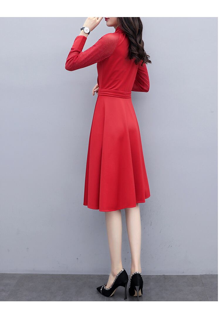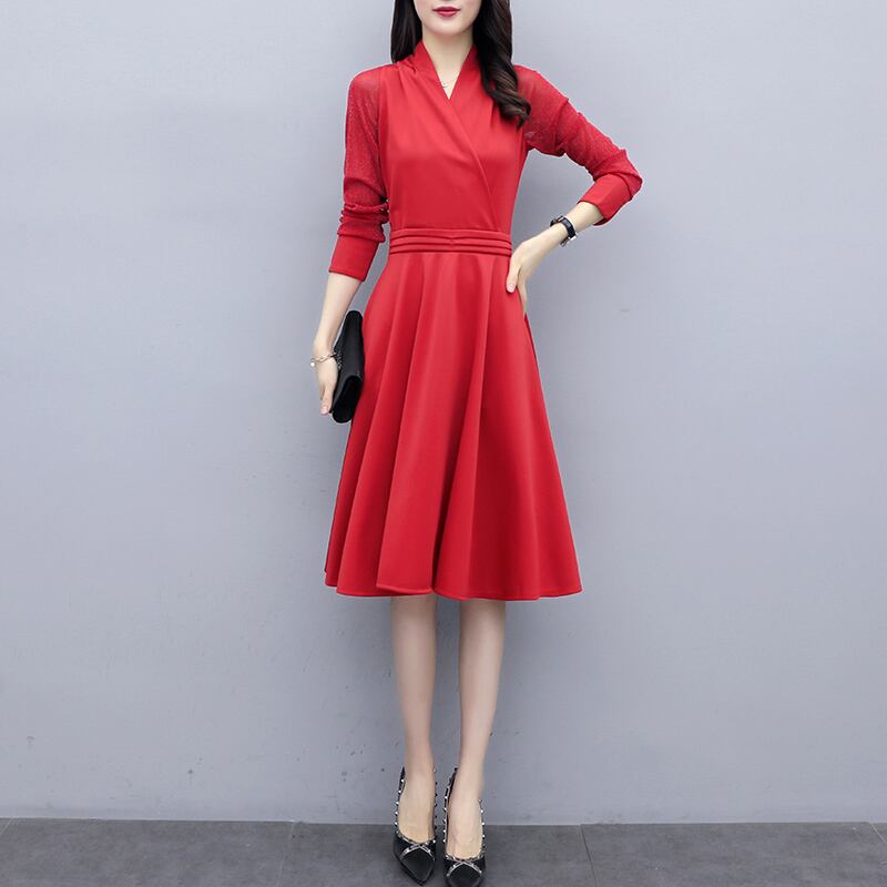 ワンピース 長袖 膝丈 レッド ブラック Vネック スリム 細身 薄手 ドレス