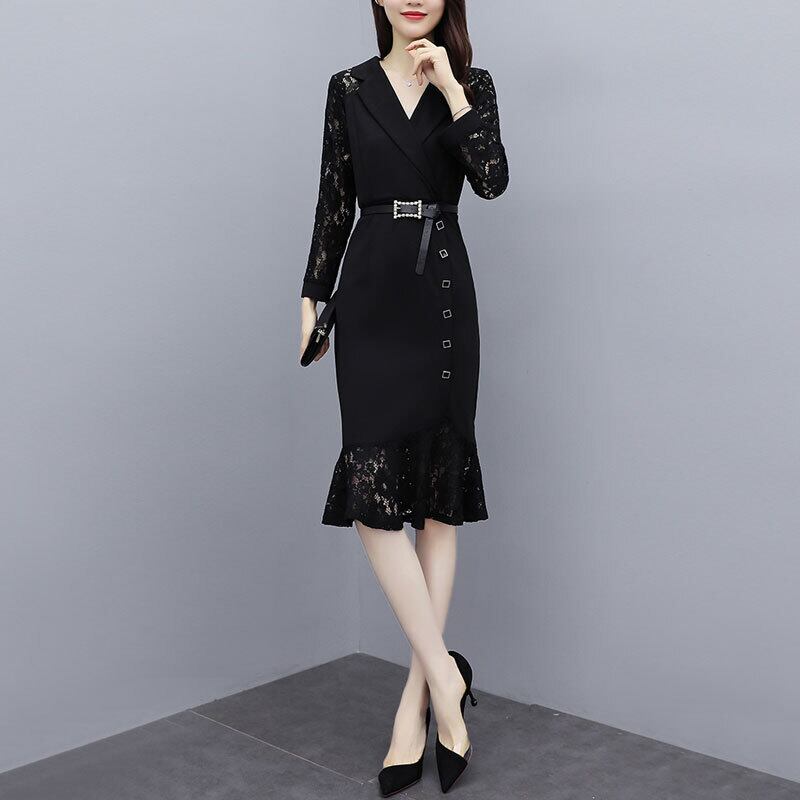 ワンピース 長袖 膝丈 レース 透け感 Vネック ベルト付き シンプル 無地 きれいめ 上品 フォーマル