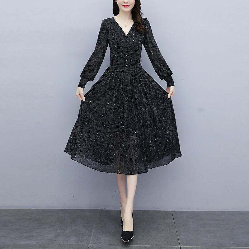 ワンピース シフォンワンピース 長袖ひざたけ フレア ラメ Vネック きれいめ 上品 フォーマル お呼ばれ