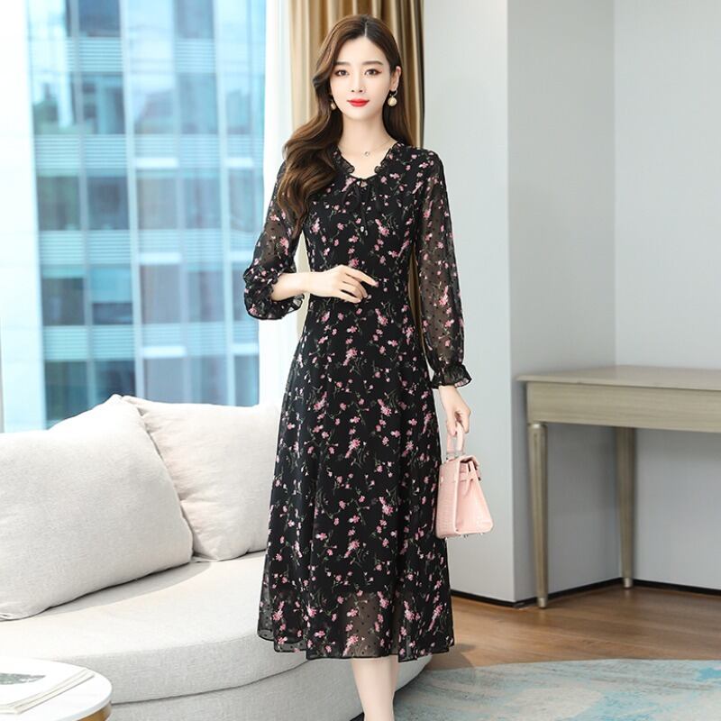 ワンピース シフォンワンピース長袖 ミモレ丈 フレア 小花柄 きれいめ 大人可愛い 上品 デート お出かけ
