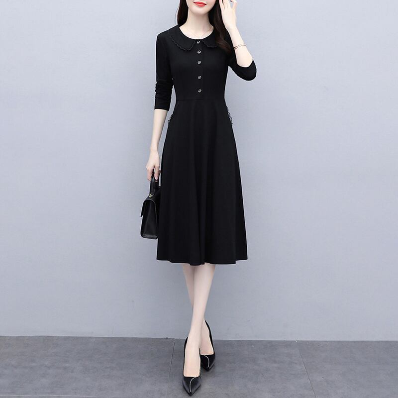 ワンピース 長袖 膝丈 フレア 襟付き フロントボタン シンプル 無地 きれいめ 上品 デート お出かけ