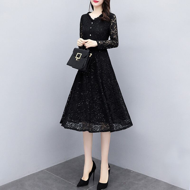 ワンピース 長袖 膝丈 総レース フレア フロントボタン くびれデザイン きれいめ 上品 フォーマル お呼ばれ