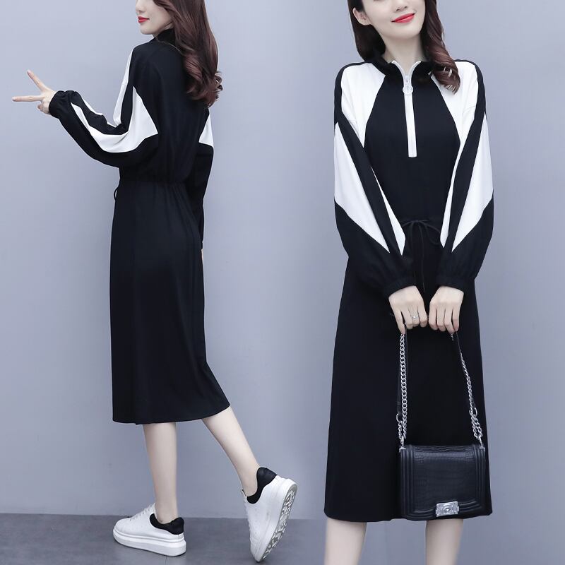 ワンピース 長袖 膝丈 襟付き ウエストリボン カジュアル モノトーン ジャージ スポーティー 秋