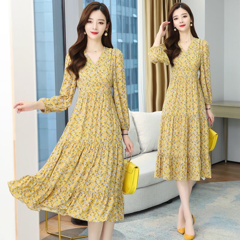 ワンピース 長袖 ミモレ丈 Vネック 花 フラワー イエロー レトロ ティアード 春 秋