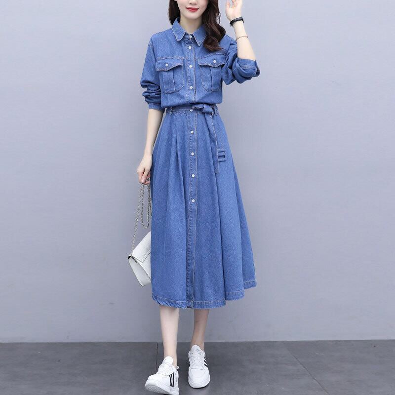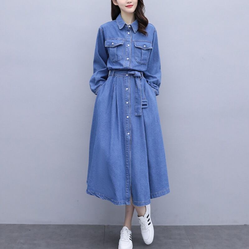 ワンピース デニムワンピース 長袖 ミモレ丈 フレア ウエストベルト カジュアル ゆったり デート 秋