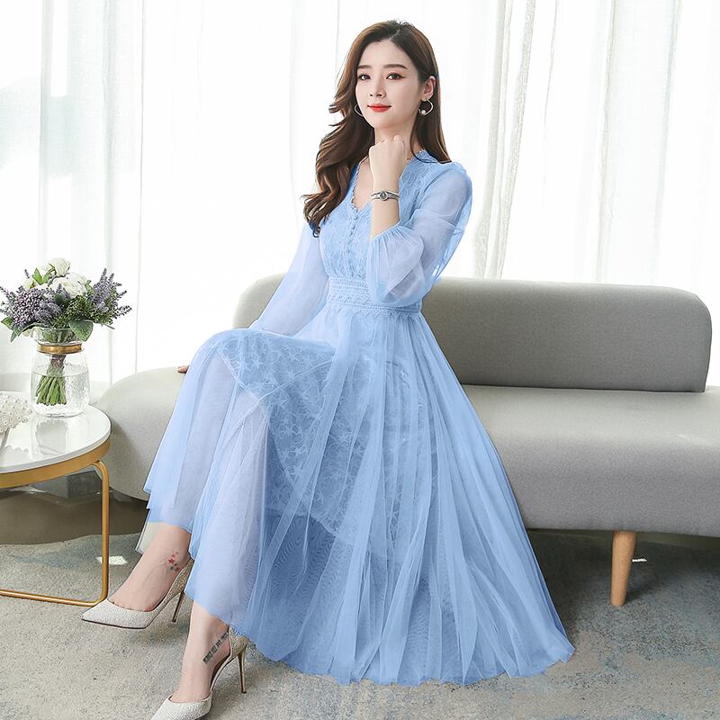 ワンピース ドレス 長袖 膝丈 フレア チュール レース 透け感 パフスリーブ 大人可愛い フォーマル