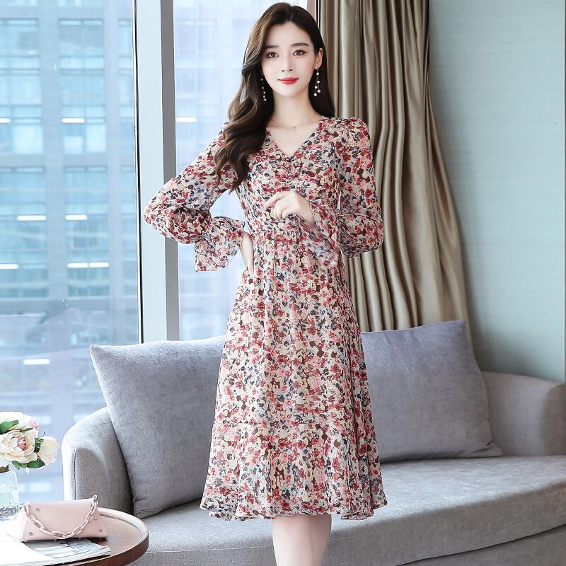 ワンピース 長袖 膝丈 Vネック フレア 小花柄 キャンディースリーブ 大人可愛い デート お出かけ