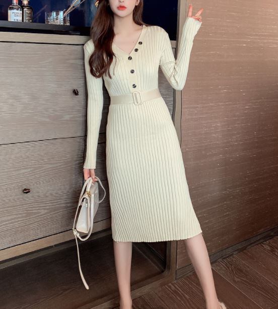 ワンピース ニットワンピース 長袖 ミモレ丈 リブ フロントボタン ウエストベルト シンプル 大人カジュアル
