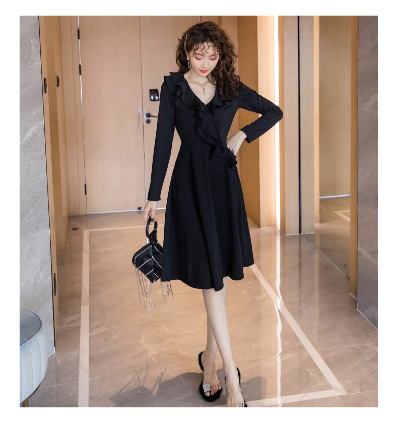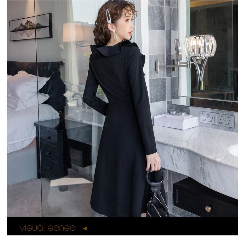 ワンピース 長袖 膝丈 フレア フリル シンプル 無地 きれいめ 上品 大人可愛い デート お出かけ