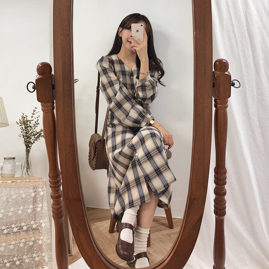 ワンピース 長袖 ミモレ丈 フレア フロントボタン チェック柄 大人カジュアル トラッド 秋 デート