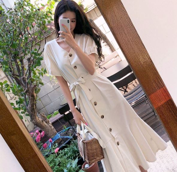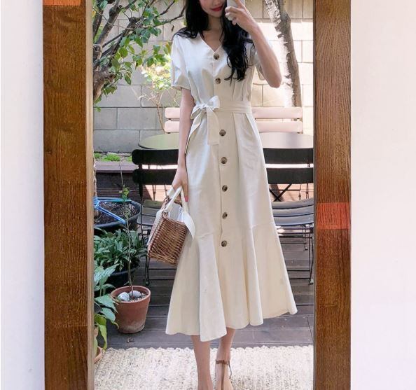 ワンピース 半袖 ミモレ丈 パフスリーブ フロントボタン ウエストリボン シンプル 大人カジュアル デート