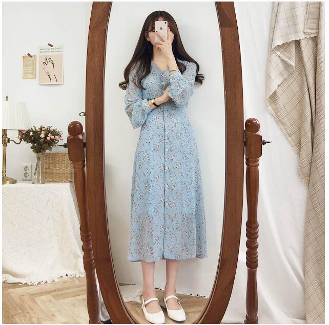 ワンピース シフォンワンピース 長袖 ミモレ丈 フレア 小花柄 大人可愛い デート お出かけ 秋