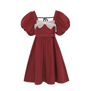 ワンピース ドレス パーティー ワインレッド リボン 半袖 バルーン袖 ミニ ショート