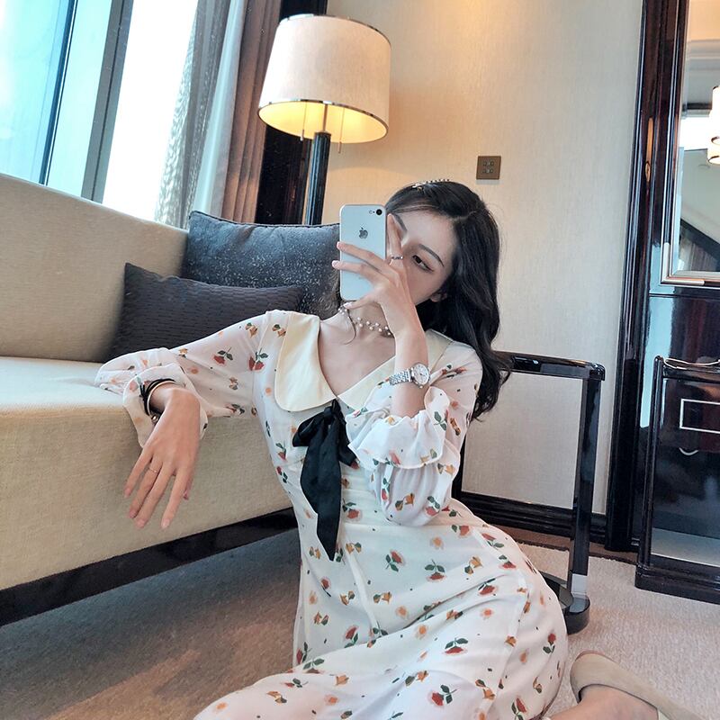 ワンピース 長袖 ミモレ丈 フレア 小花柄 襟付き リボン 大人可愛い デート お出かけ 秋