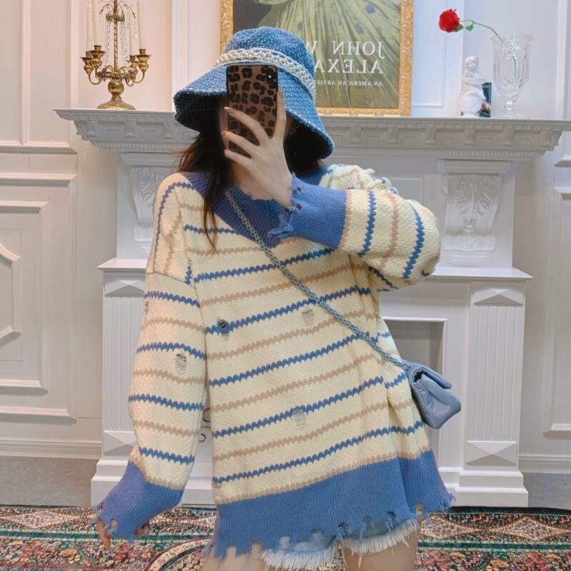 ニット セーター 長袖 ボーダー柄 切りっぱなし カジュアル ゆったり ビッグサイズ お出かけ 秋