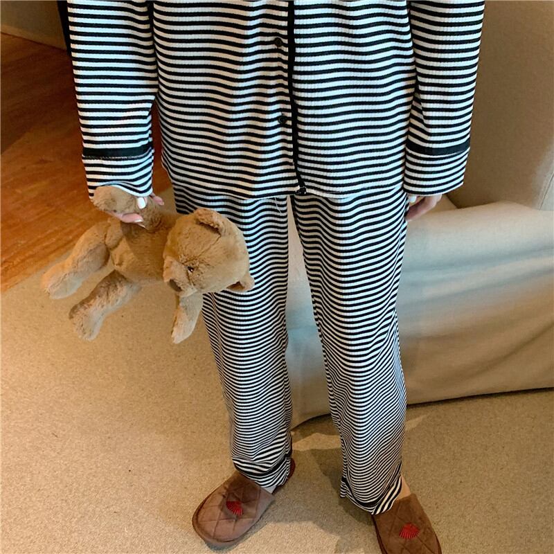 パジャマ ルームウェア 長袖 ロングパンツ ボーダー柄 カジュアル ゆったり 薄手 秋