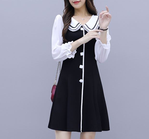 ワンピース 長袖 膝丈 フレア 襟付き シフォン きれいめ 上品 デート お出かけ 秋