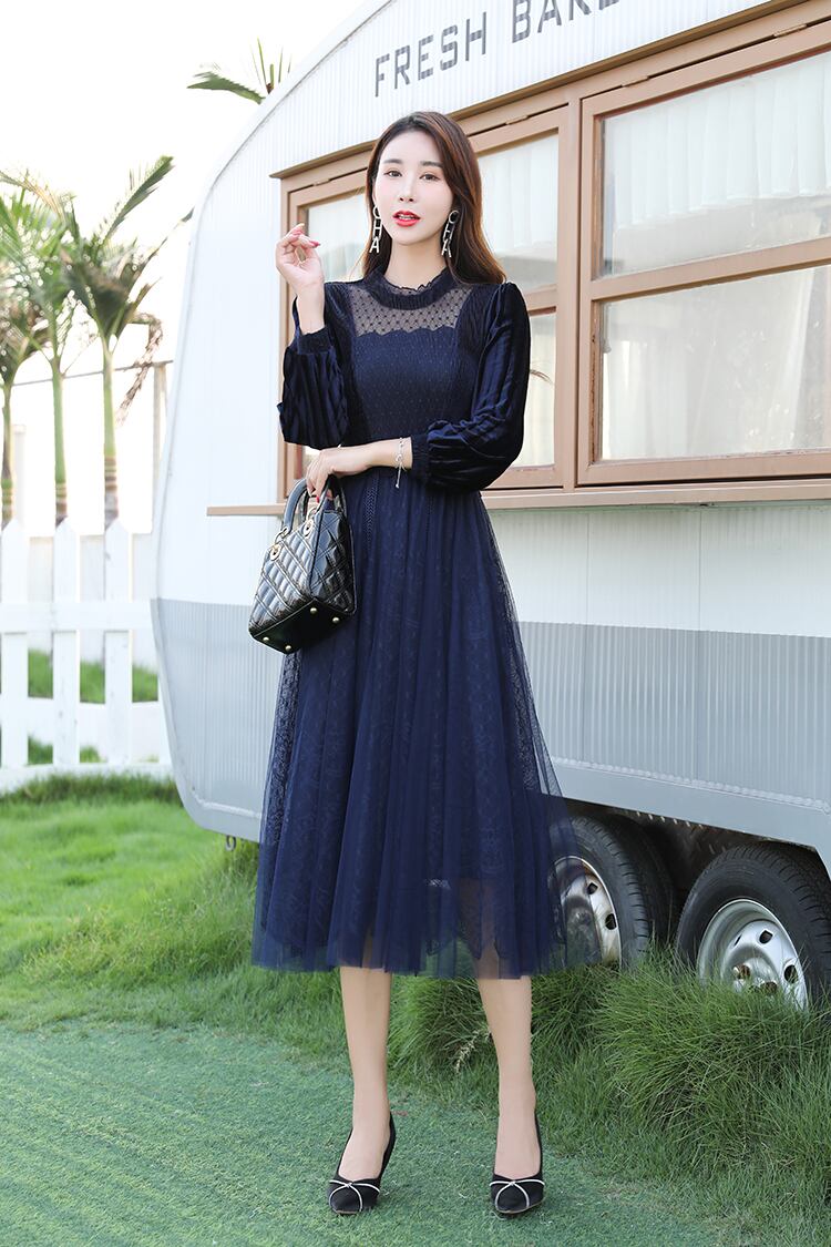 ワンピース 長袖 膝丈 チュール ベロア フレア シースルー 透け感 大人可愛い フォーマル お呼ばれ