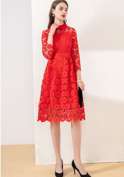 ワンピース ドレス 長袖 膝丈 フレア 総レース フラワーレース 襟付き きれいめ 上品 フォーマル