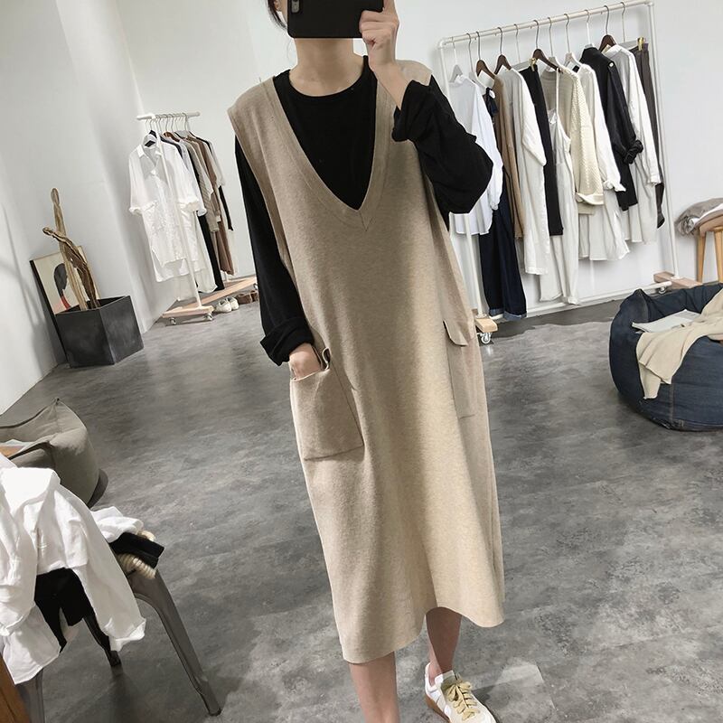 ワンピース ノースリーブ 膝丈 Vネック シンプル 無地 大人カジュアル レイヤード デイリー 秋