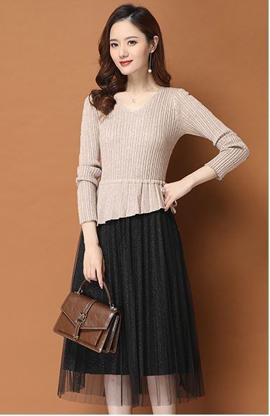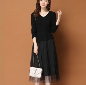 ワンピース ニットワンピース 長袖 膝丈 ドッキングデザイン チュール きれいめ デート お出かけ