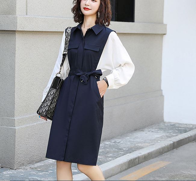 ワンピース シャツワンピース 長袖 膝丈 タイトフロントボタン ウエストベルト 大人カジュアル お出かけ