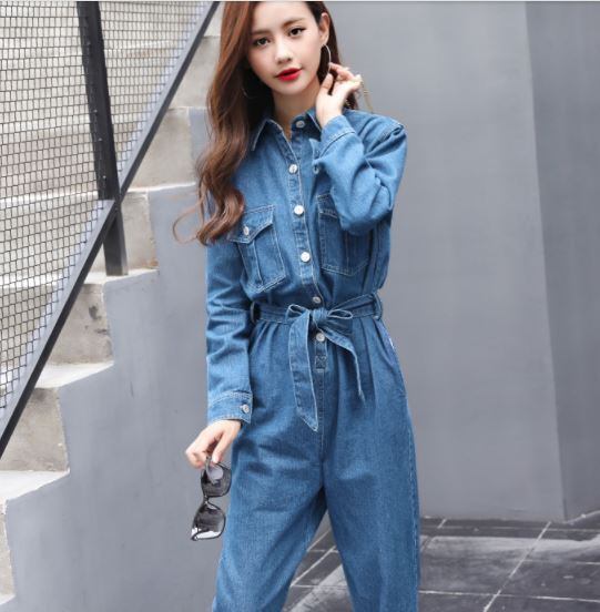 オールインワン ジャンプスーツ デニム 長袖 ウエストベルト シンプル カジュアル お出かけ 秋