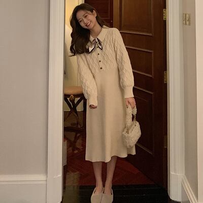 ワンピース ニットワンピース 長袖 膝丈 フレア ケーブル編み シンプル 無地 大人カジュアル
