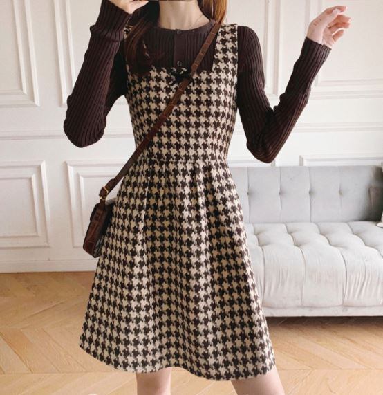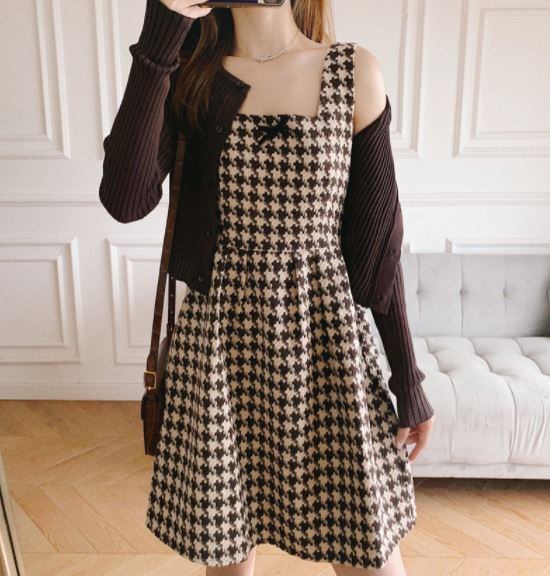 シンプルなニットカーディガンと千鳥格子柄のワンピースのセットです♪