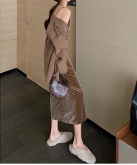 大人カジュアルなベロアワンピースとニットカーディガンのツーピースです♪