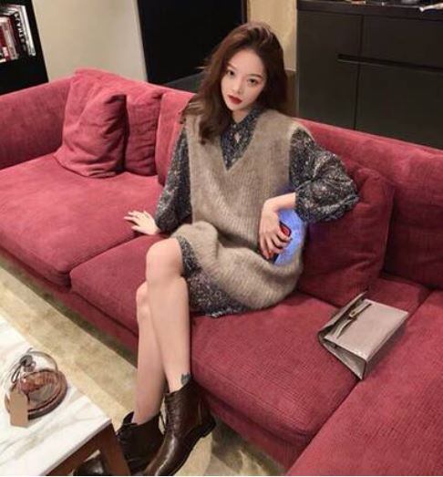 セットアップ ツーピース ニットベスト ワンピース 長袖 膝丈 小花柄 大人カワイ藍 デート お出かけ