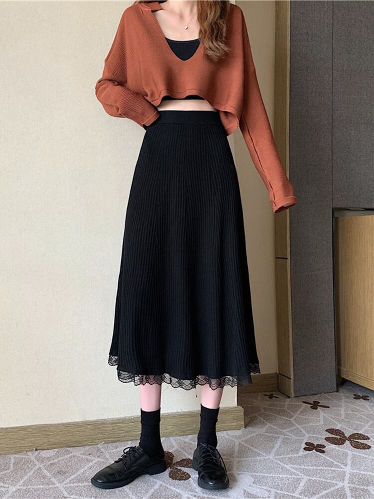 スカート ニットスカート ミモレ丈 レース ハイウエスト シンプル 無地 大人可愛い デート 秋 冬