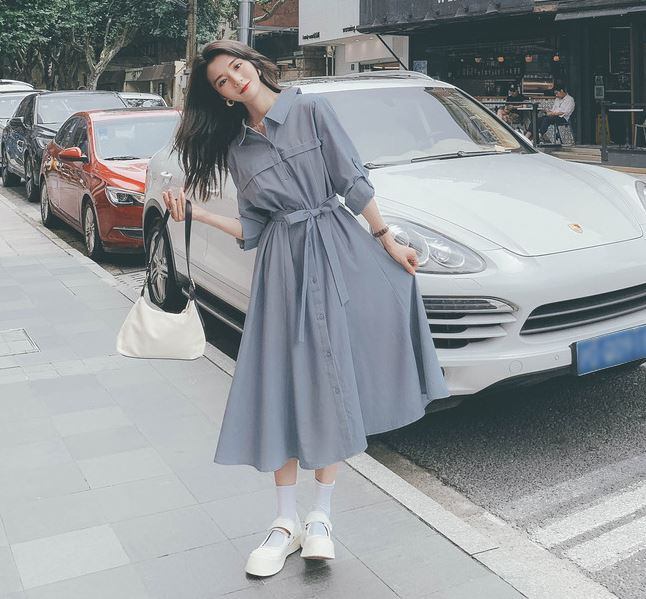 ワンピース シャツワンピース 長袖 ミモレ丈 フレア ウエストベルト シンプル 無地 大人カジュアル
