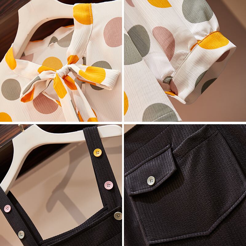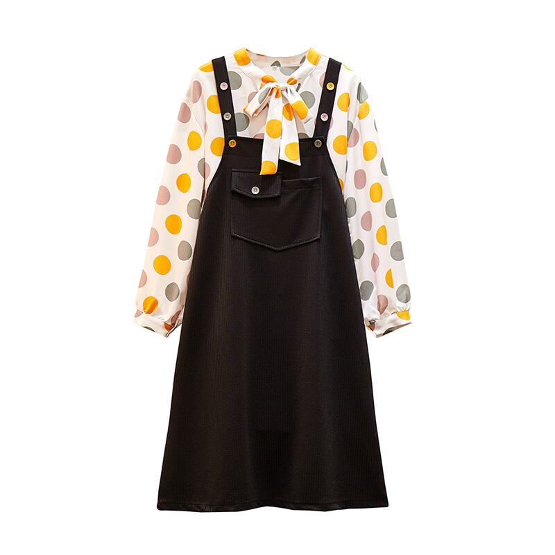 ツーピース セットアップ 長袖 ブラウス ドット柄 ボウタイ ワンピース ジャンパースカート 膝丈