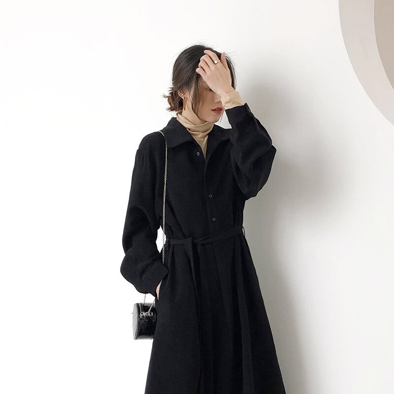 ワンピース シャツワンピース 長袖 膝丈 フレア ウエストベルト シンプル 無地 大人カジュアル デート