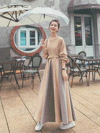 ワンピース ロング カーキ 長袖 チェック Aライン ベルト
