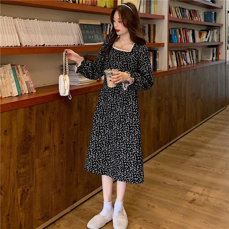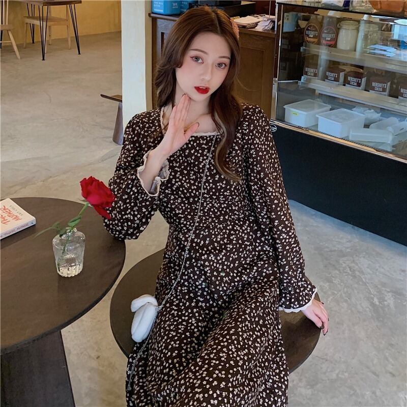ワンピース シフォンワンピース 長袖 ミモレ丈 フレア 小花柄 大人可愛い レトロ デート お出かけ