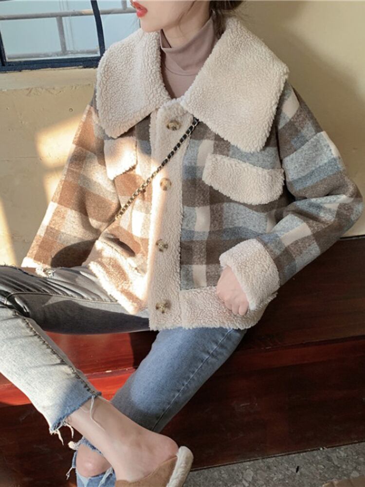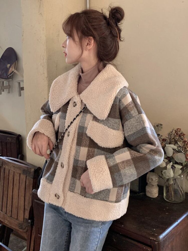 ジャケット ボアジャケット ボアコート 長袖 ショート丈 チェック柄 襟付き 大人カジュアル 秋 冬