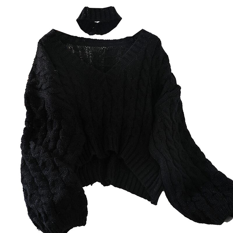 ニット セーター 長袖 Vネック ケーブル編み ショート丈 シンプル 無地 大人カジュアル チョーカー付