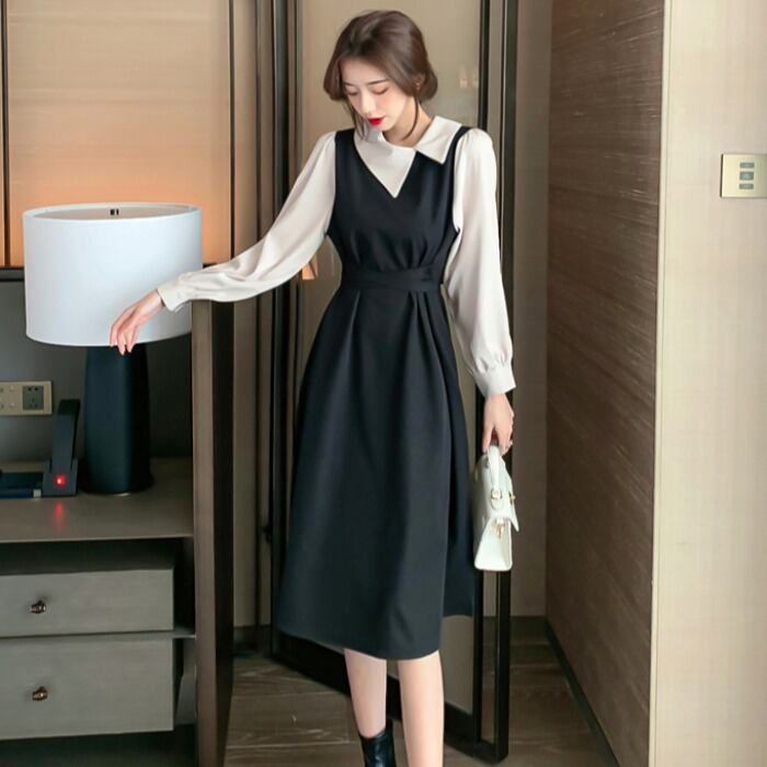 ワンピース 長袖 膝丈 フレア 重ね着風 ウエストリボン きれいめ 上品 大人可愛い デート お出かけ