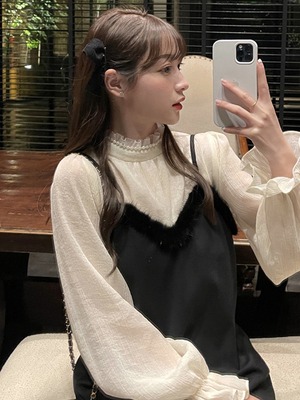 きれいめなシフォン素材の長袖ブラウスとキャミソールワンピースのセットです♪