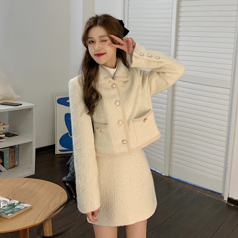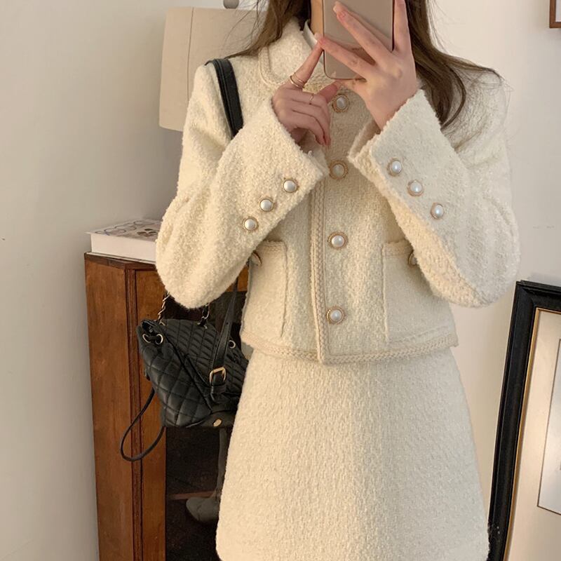 セットアップ ツーピース スーツ 長袖 ジャケット ミニスカート パールボタン ツイード きれいめ 上品