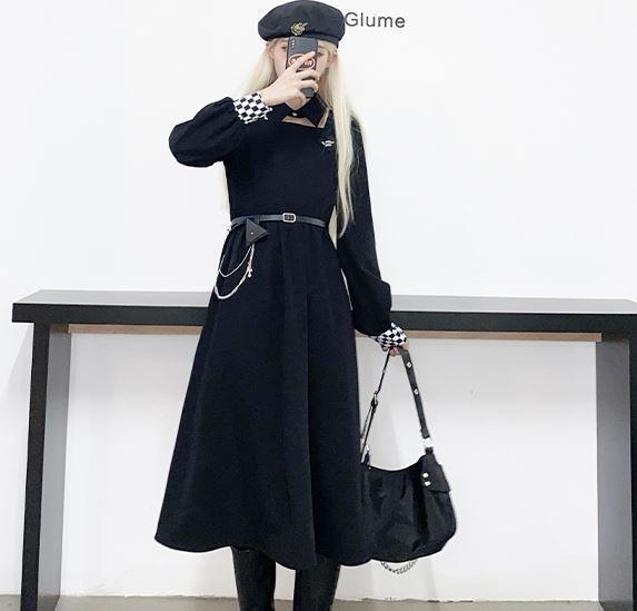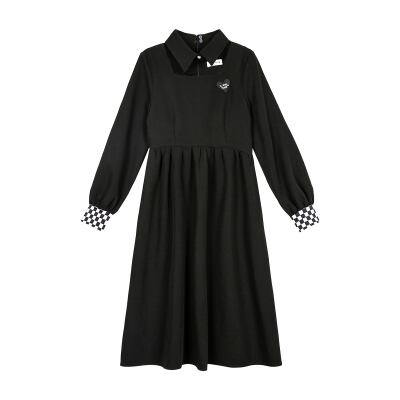 ワンピース 長袖 ミモレ丈 フレア 襟付き ブロックチェック シンプル 無地 大人カジュアル 秋