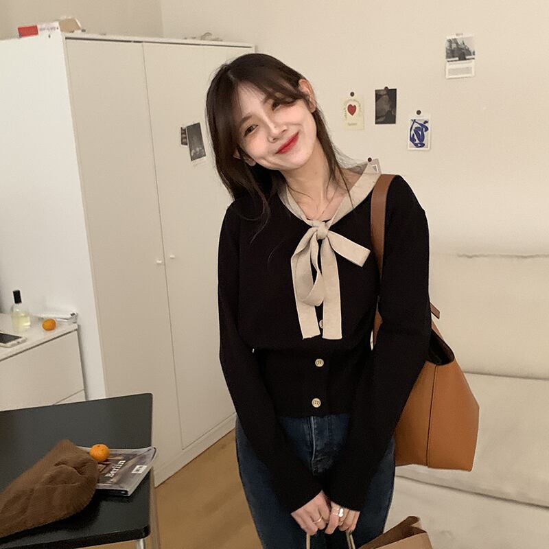 カーディガン ニットカーディガン 長袖 リボン シンプル 無地 バイカラー カジュアル きれいめ 秋 冬