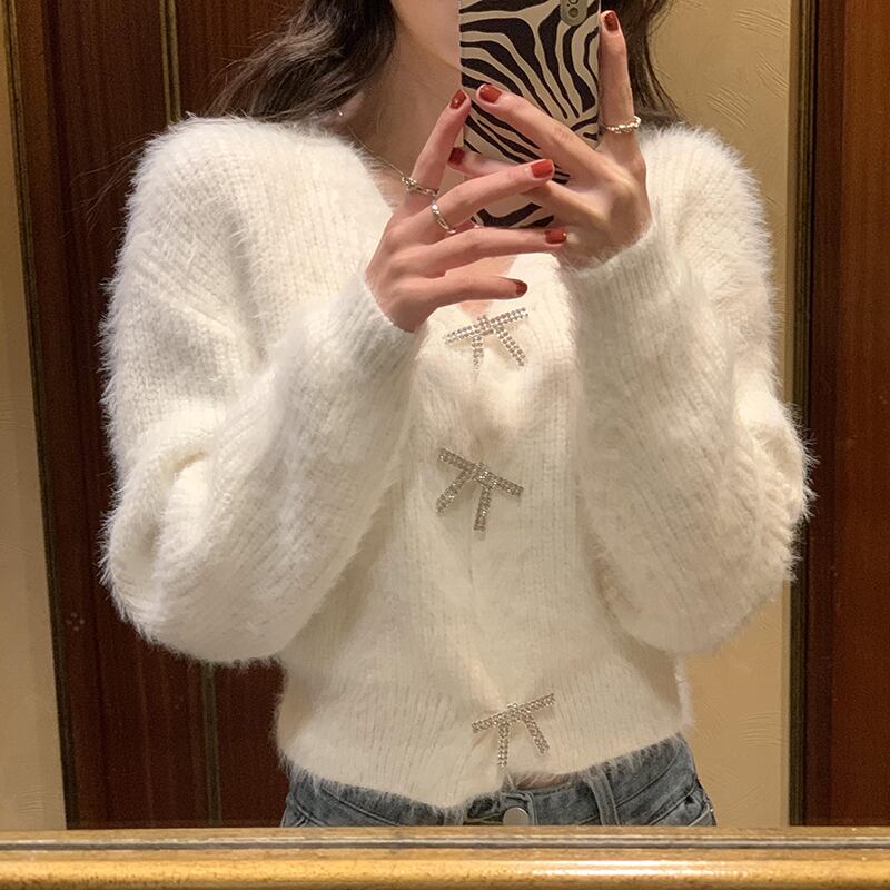 ニット セーター 長袖 モヘア Vネック リボン ビジューボタン 大人可愛い きれいめ 上品 デート