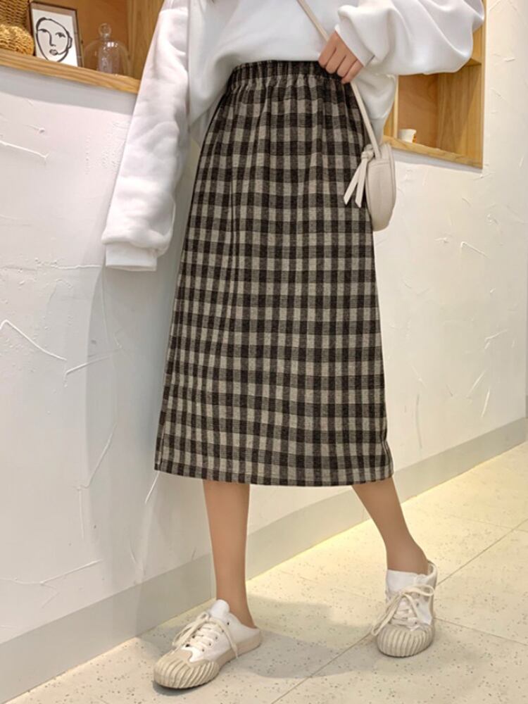 スカート ミモレ丈 チェック スリット ブラック ブラウン