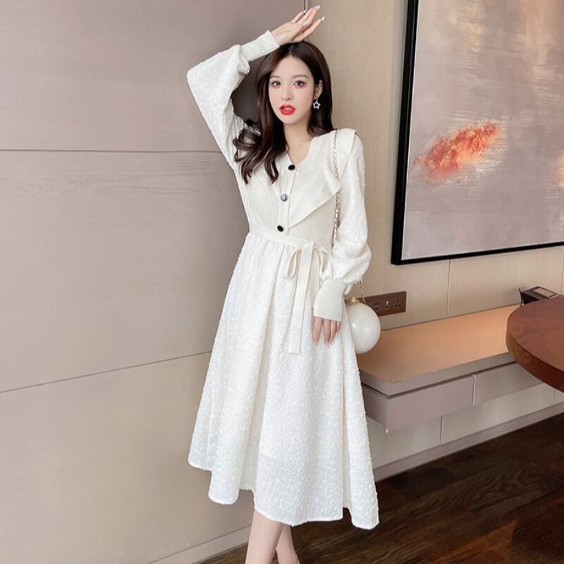 ワンピース 長袖 膝丈 フレア Vネック フリル フロントボタン ウエストリボン きれいめ 大人可愛い お出かけ