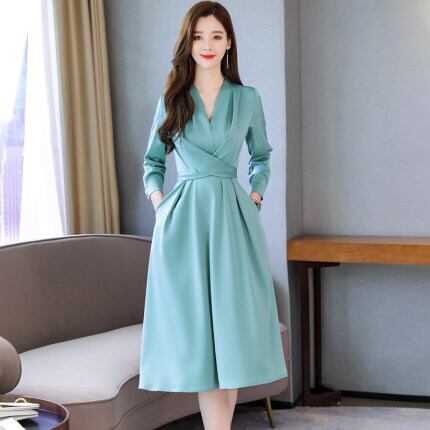 ワンピース 膝丈 長袖 ブラック レッド コーヒー ブルー Vネック 大人 フェミニン セクシー