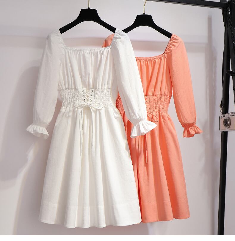 ワンピース 長袖 膝丈 フレア ウエストギャザー スクエアネック シンプル 無地 大人可愛い デート 春