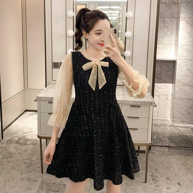 ワンピース 長袖 ミニ丈 シフォン ツイード 透け感 フレア リボン きれいめ 上品 大人可愛い